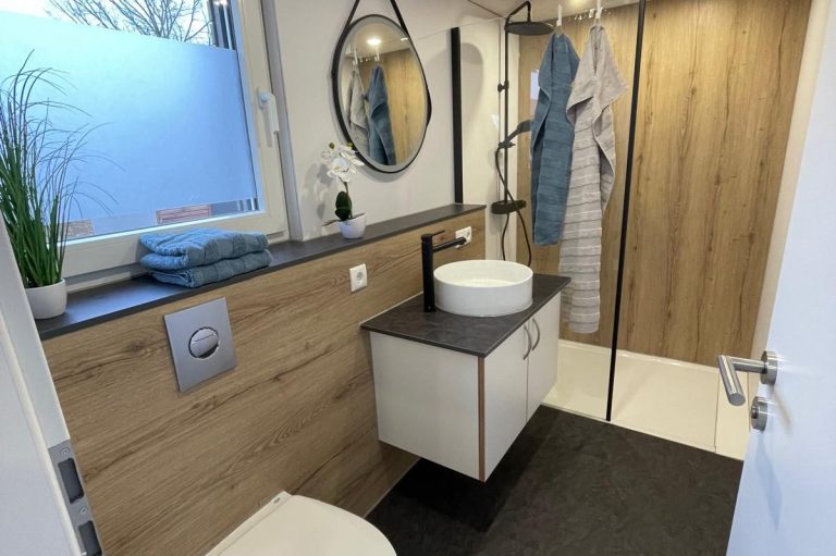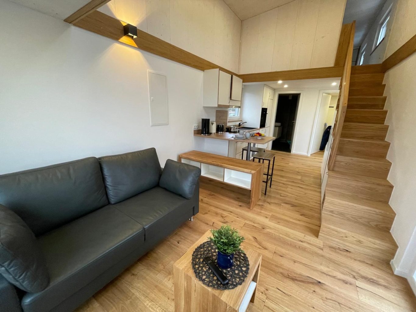 Das Tinyhaus verfügt über ein Schlafzimmer, Schlafnische im Obergeschoß, Wohn-/Essbereich und Bad. Gäste können im ganzen Haus kostenloses W-LAN nutzen, alle Zimmer sind mit einem Eiche Parkett ausgelegt und werden über eine Fußbodenheizung beheizt (außer obere Schlafnische),die individuell regelbar ist.